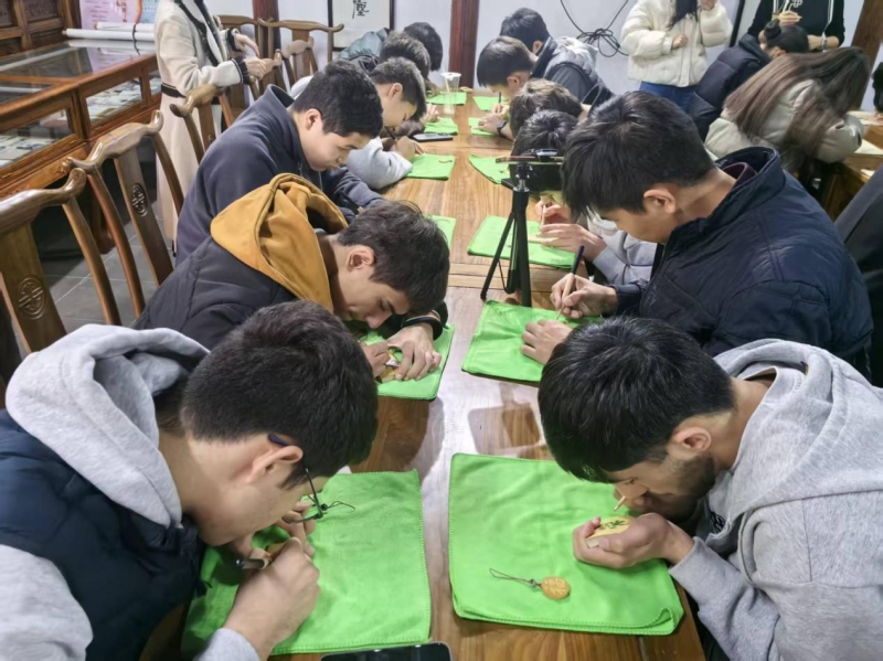 “留青,是留竹之青;刻,是刻文化之骨。”江苏省非遗代表性传承人、太湖竹刻名家徐敏老师从唐代“筠片”到明代“留青”,从竹纸到竹刻,再到“常州三宝”之一,20分钟的微讲座穿插着《富春山居图》竹刻复刻、梅兰竹菊臂搁等实物,让留学生们第一次直观感受“以刀代笔、以竹为纸”的东方美学。留学生ADILET边听边记:“0.1毫米,比打印纸还薄,中国人竟能在上面写诗作画,太不可思议了!”