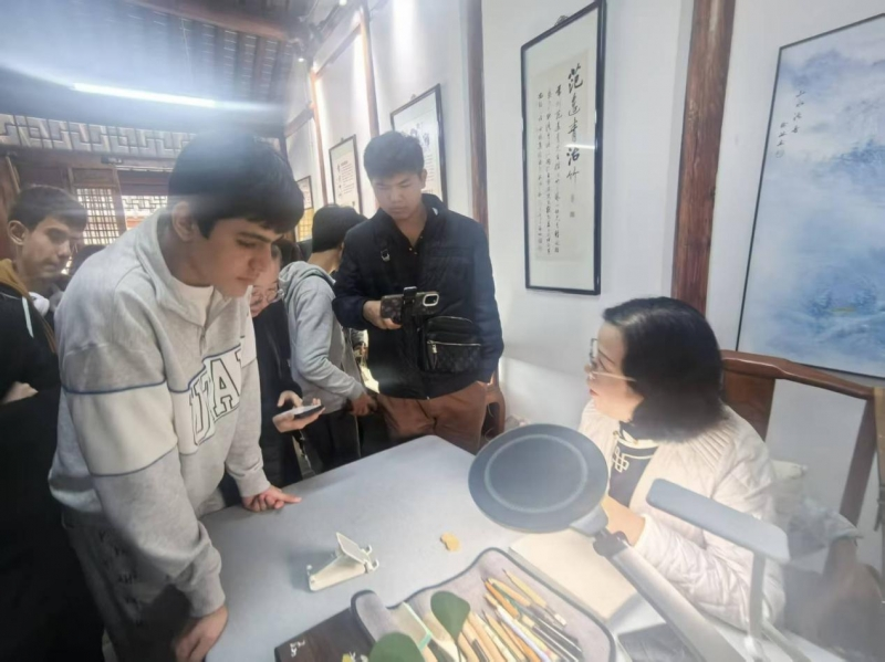 “留青,是留竹之青;刻,是刻文化之骨。”江苏省非遗代表性传承人、太湖竹刻名家徐敏老师从唐代“筠片”到明代“留青”,从竹纸到竹刻,再到“常州三宝”之一,20分钟的微讲座穿插着《富春山居图》竹刻复刻、梅兰竹菊臂搁等实物,让留学生们第一次直观感受“以刀代笔、以竹为纸”的东方美学。留学生ADILET边听边记:“0.1毫米,比打印纸还薄,中国人竟能在上面写诗作画,太不可思议了!”